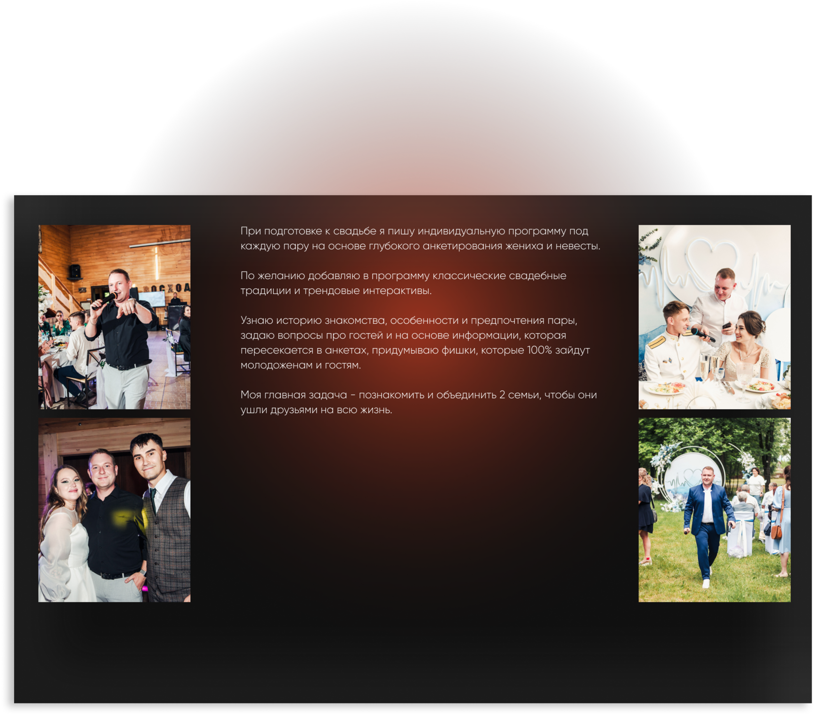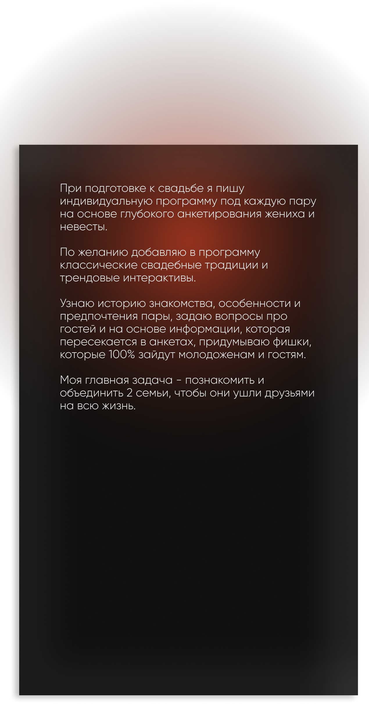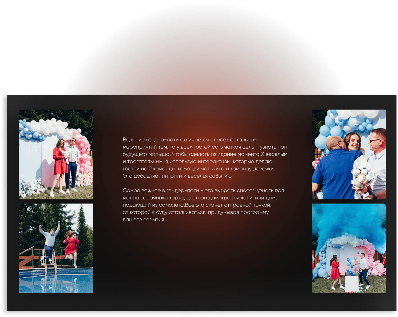 Для каждого события они индивидуальны и обсуждаются с каждым клиентом лично. Но точно могу сказать, мы простые люди, которые живут с вами в одной области и городах и с кем то даже на одной улице. Поэтому Особых гримерок, фуагра и шампанского не нужно.