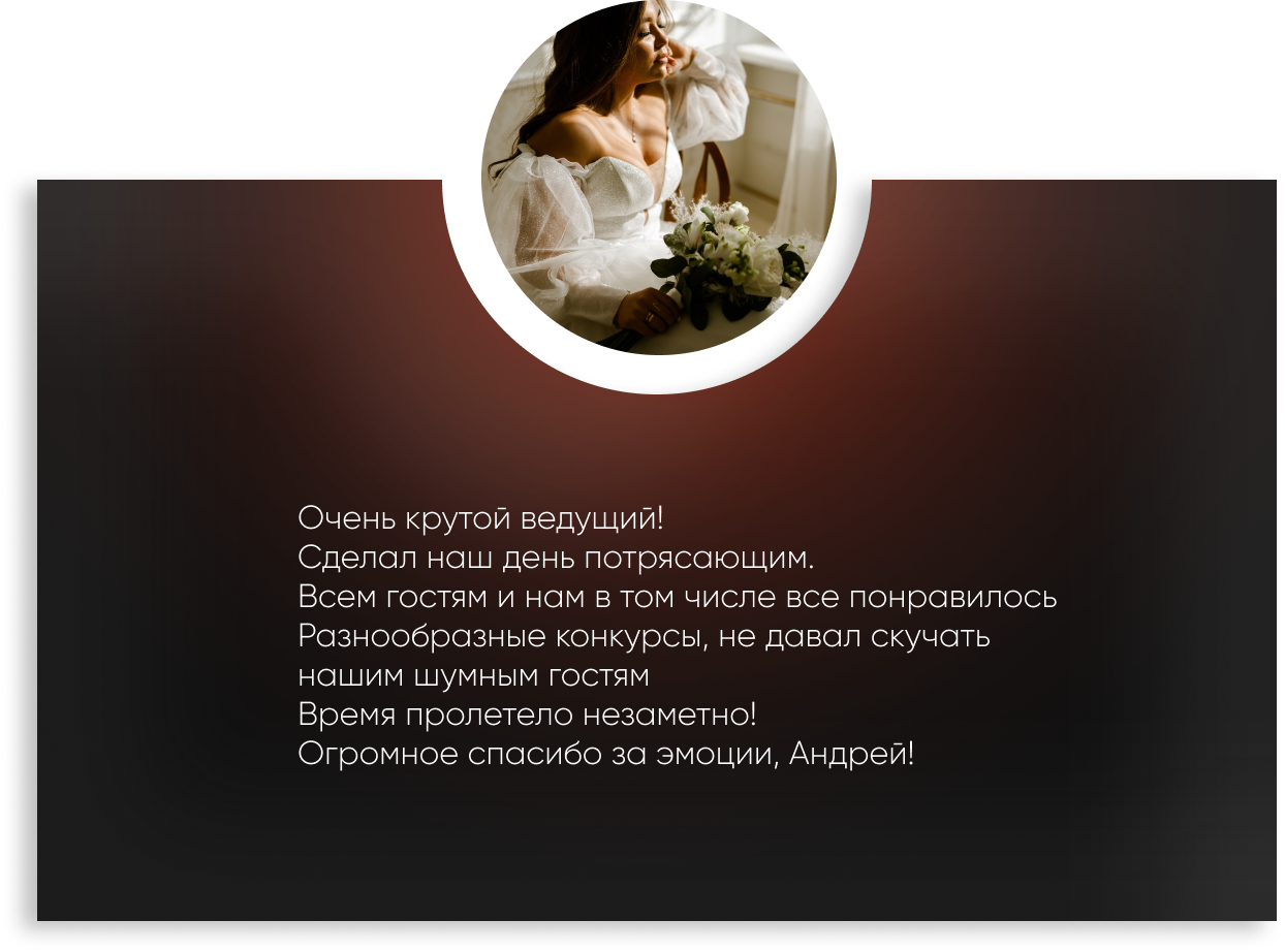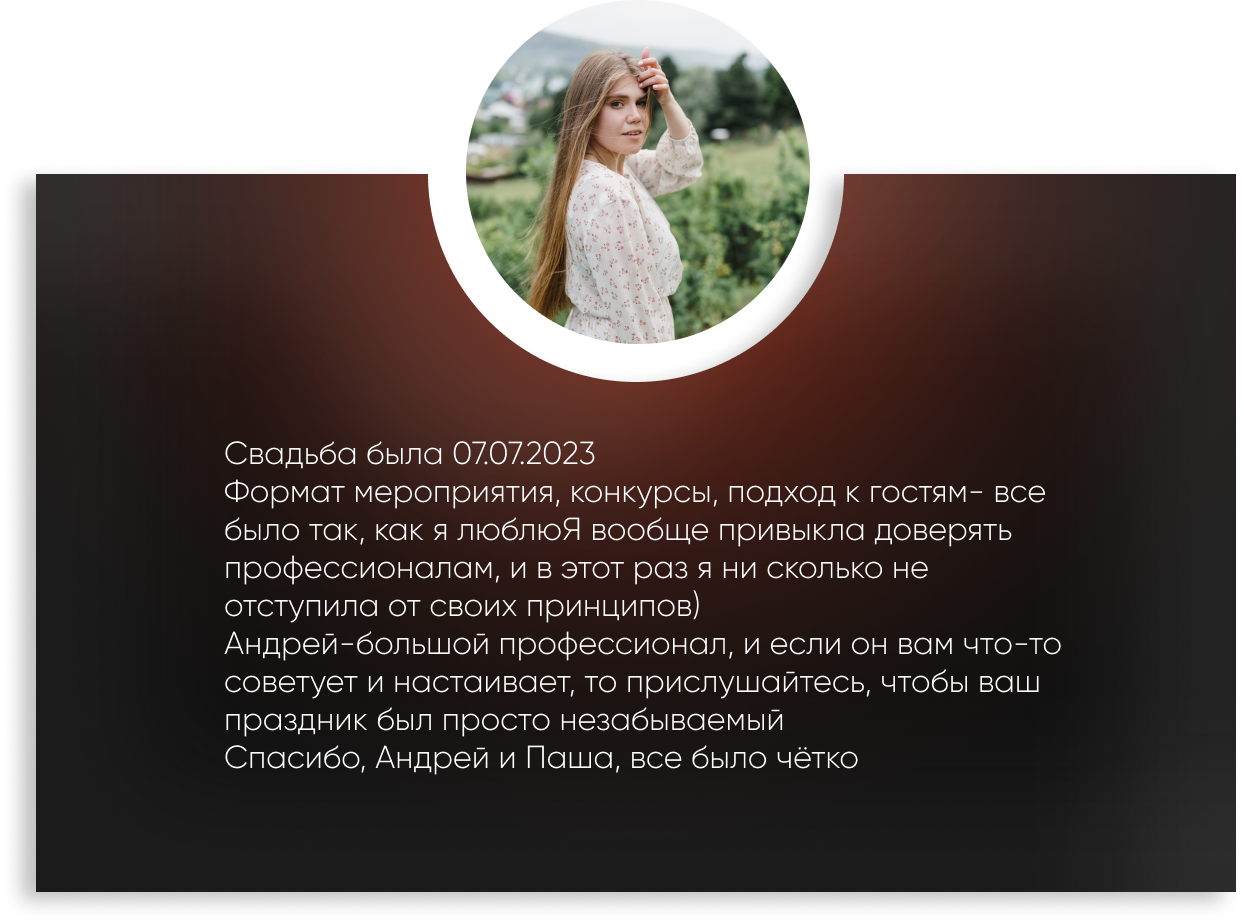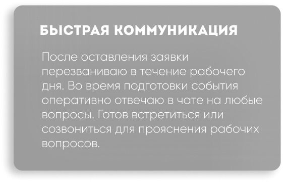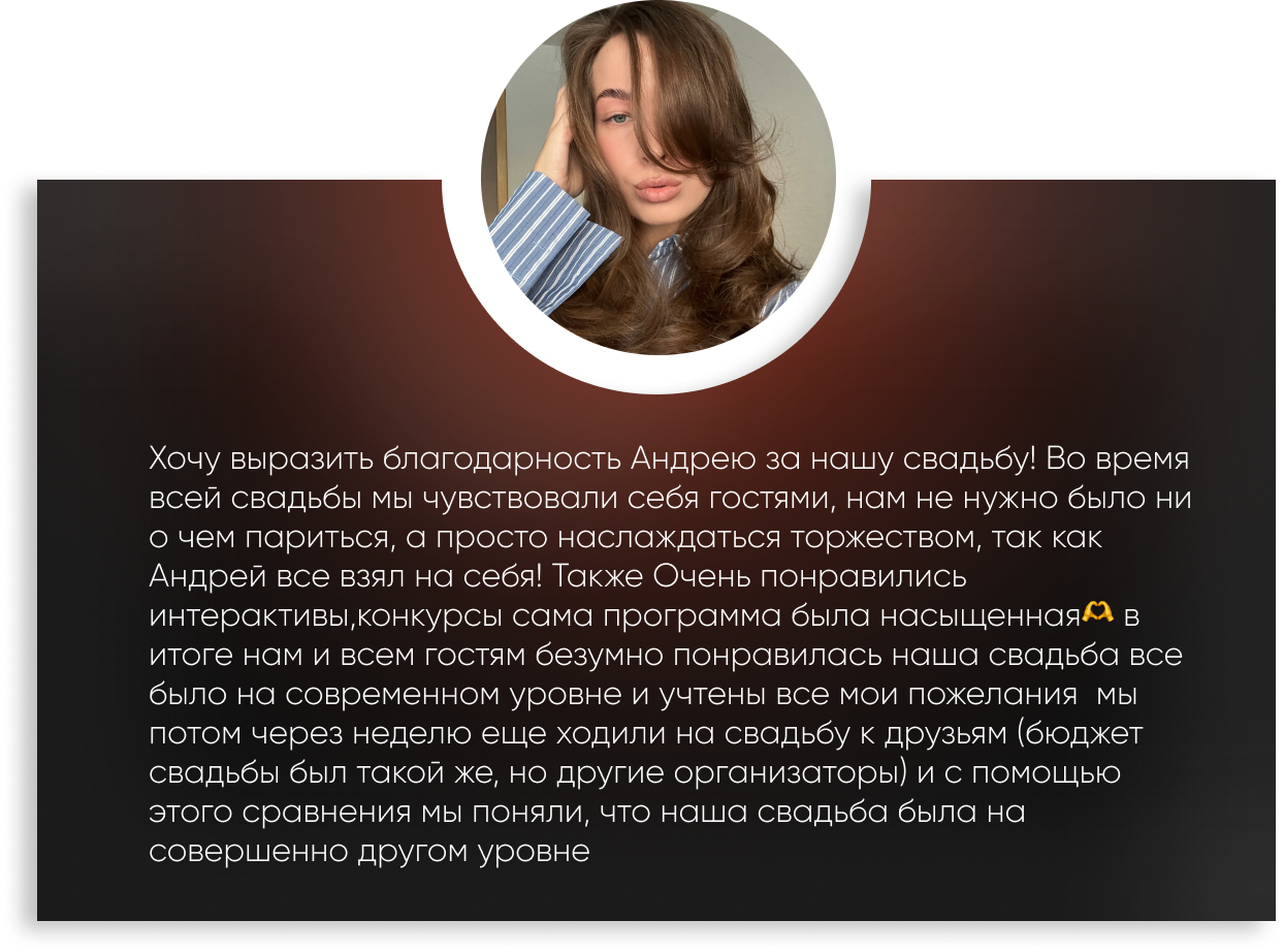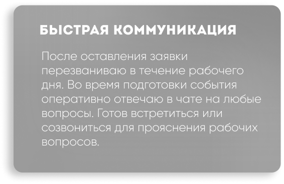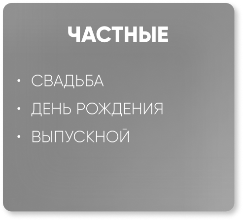 Для каждого события они индивидуальны и обсуждаются с каждым клиентом лично. Но точно могу сказать, мы простые люди, которые живут с вами в одной области и городах и с кем то даже на одной улице. Поэтому Особых гримерок, фуагра и шампанского не нужно.