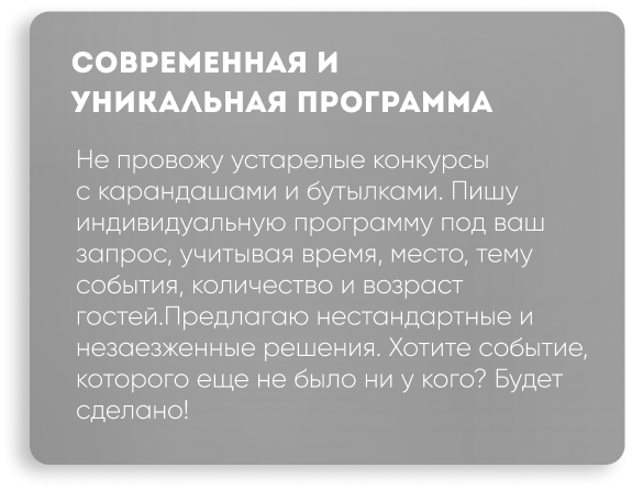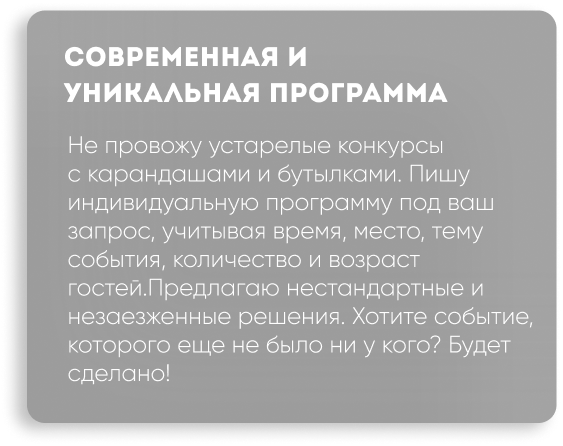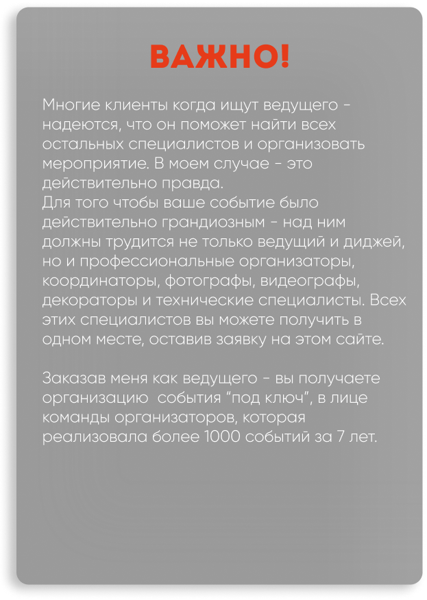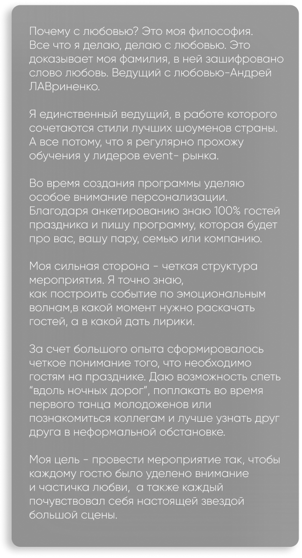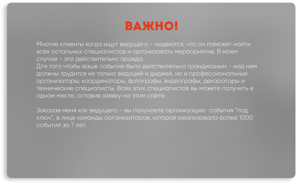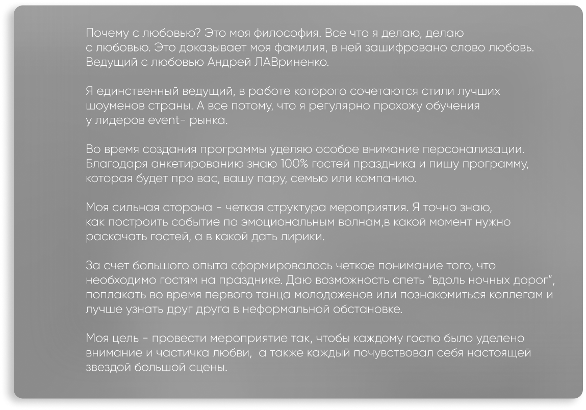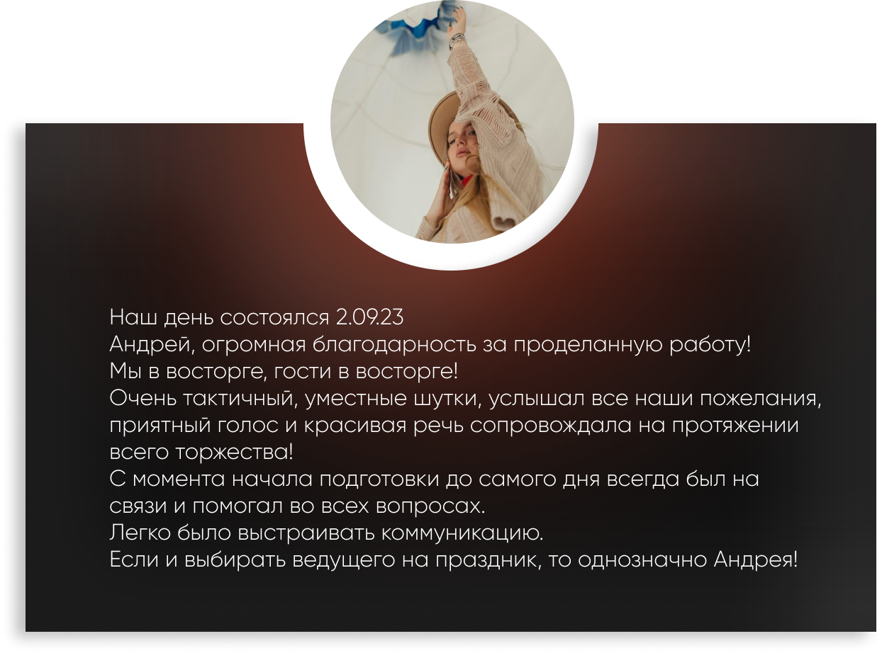 Для каждого события они индивидуальны и обсуждаются с каждым клиентом лично. Но точно могу сказать, мы простые люди, которые живут с вами в одной области и городах и с кем то даже на одной улице. Поэтому Особых гримерок, фуагра и шампанского не нужно.